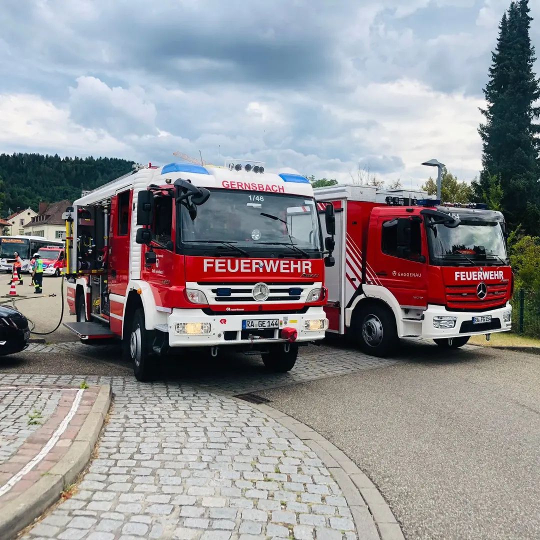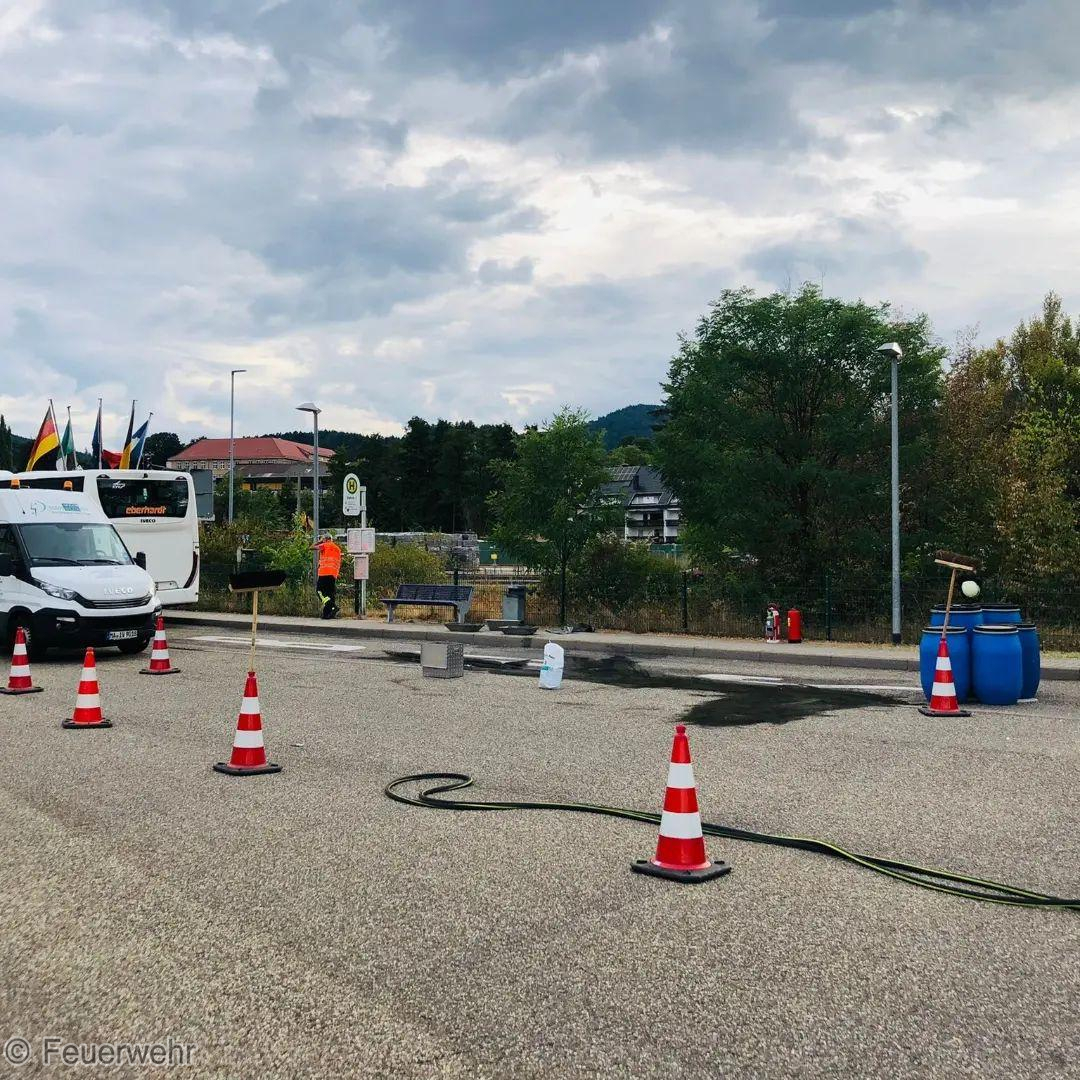 An einem Linienbus lief Kraftstoff aus. Mit Blechwannen und Ölbindemittel nahmen wir als eine erste Maßnahme den Diesel auf. Da die Undichtigkeit vor Ort nicht behoben werden konnte, musste der Kraftstoff abgepumpt werden. Das übernahmen die Kameraden der Feuerwehr Gaggenau mit ihrem Gerätewagen-Gefahrgut. Mit dem MTW wurde noch die vom Bus zuvor befahrene Strecke auf Verunreinigungen kontrolliert. Die Reinigung der Fahrbahn übernahm eine Fachfirma.