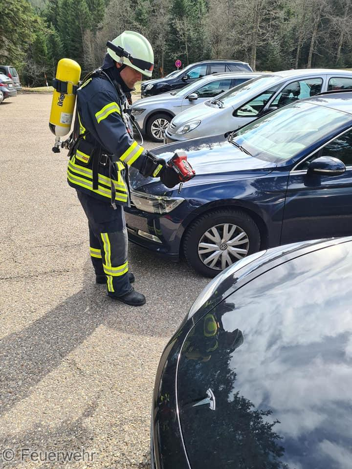 Gegen Mittag wurden wir zu einer Brandnachschau auf den Kaltenbronn alarmiert: Es war von einer Anruferin ein PKW gemeldet, der leicht rauchen sollte. Ein Feuer sei aber nicht erkennbar. Wir fuhren die Einsatzstelle an, fanden den betroffenen PKW vor. Wir kontrollierten mit der Wärmebildkamera konnten aber nichts feststellen.