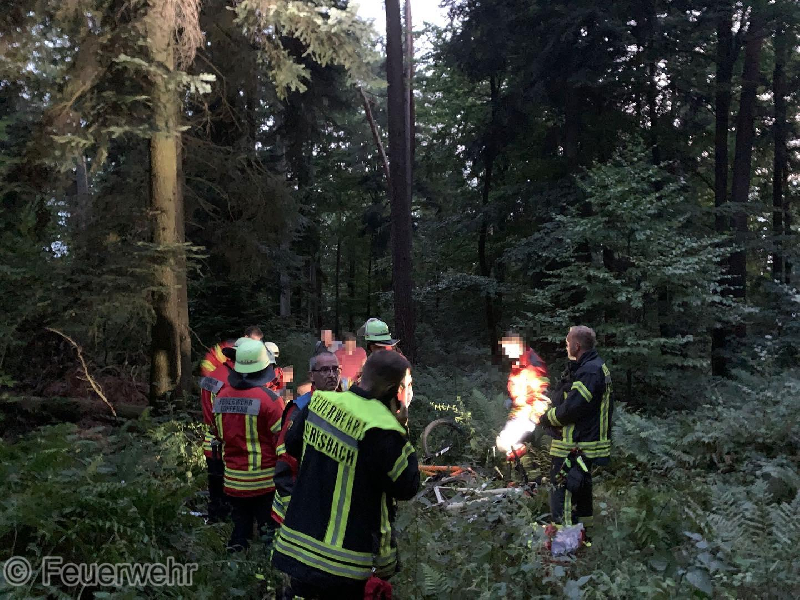 Als die Abteilungen Gernsbach und Loffenau beim Patienten angekommen waren, wurde dieser von der Feuerwehr erstversorgt und anschließend mit der Schleifkorbtrage aus dem Mountainbike Trail getragen.