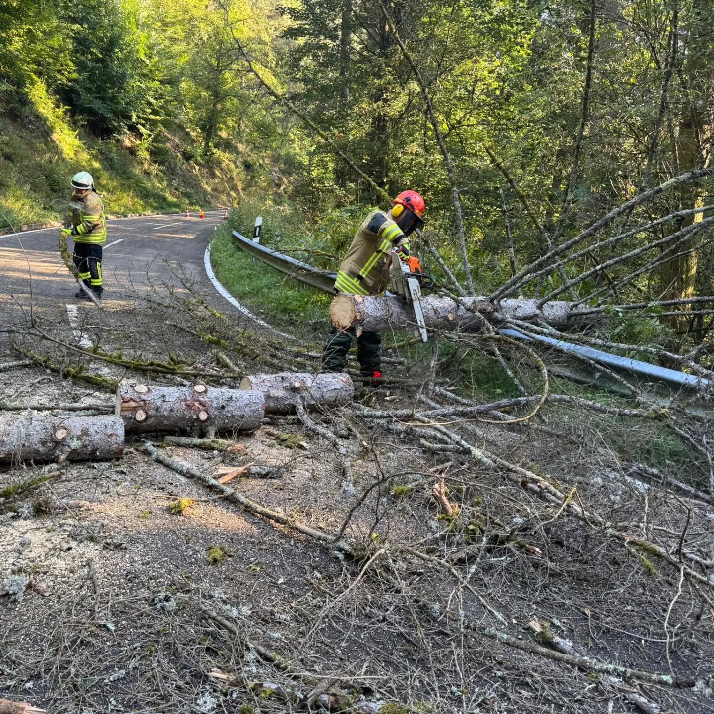 Wir wurden auf die K3701 zwischen Schloss Eberstein und Nachtigall alarmiert. Vor Ort war zuvor ein größerer morscher Baum von der Böschung auf die Straße gestürzt und blockierte diese vollständig. Wir sicherten die Gefahrenstelle ab und zersägten den Baum mittels Motorkettensäge. Im Anschluss wurde die Einsatzstelle der Straßenmeisterei übergeben welche sich um die restliche Beseitigung kümmerte