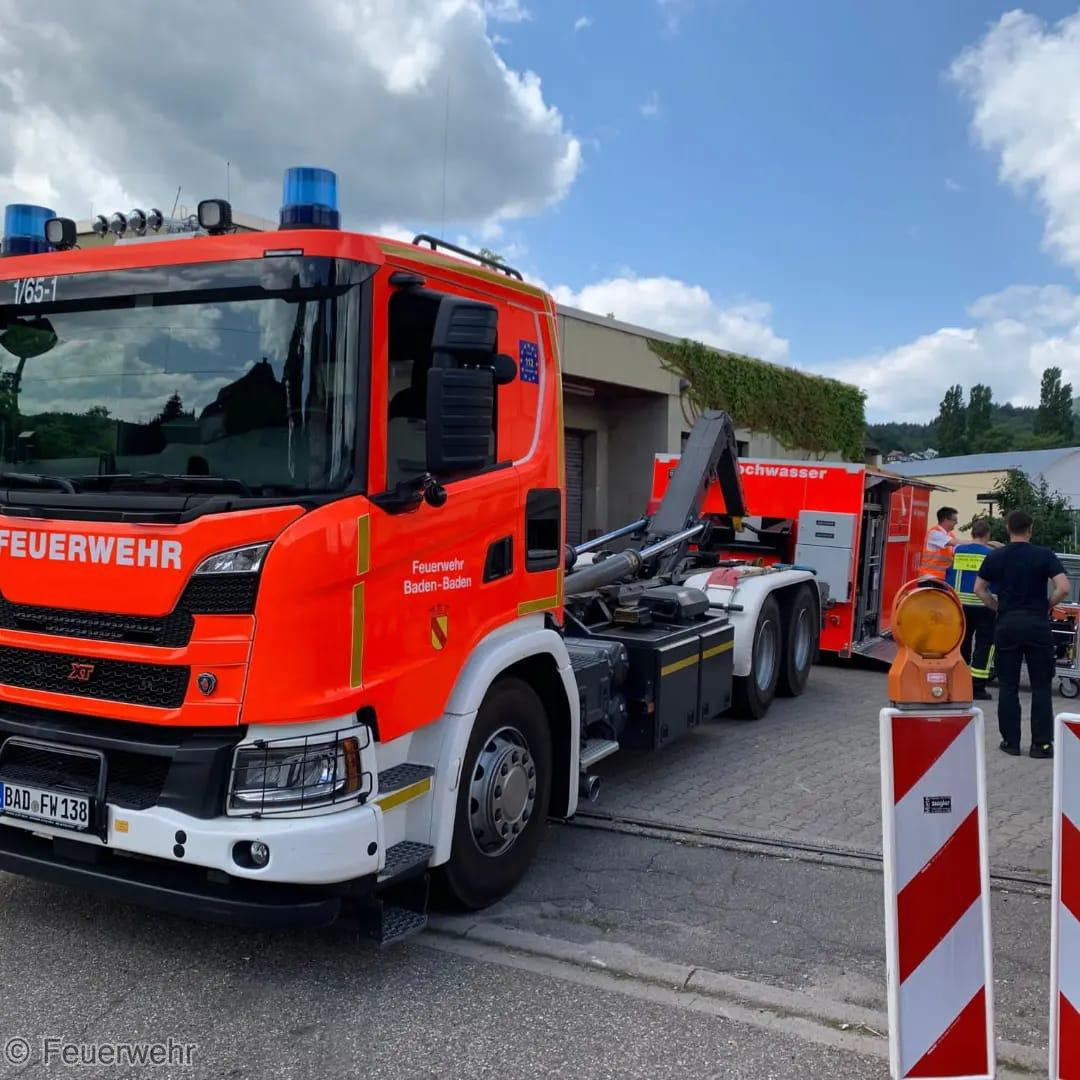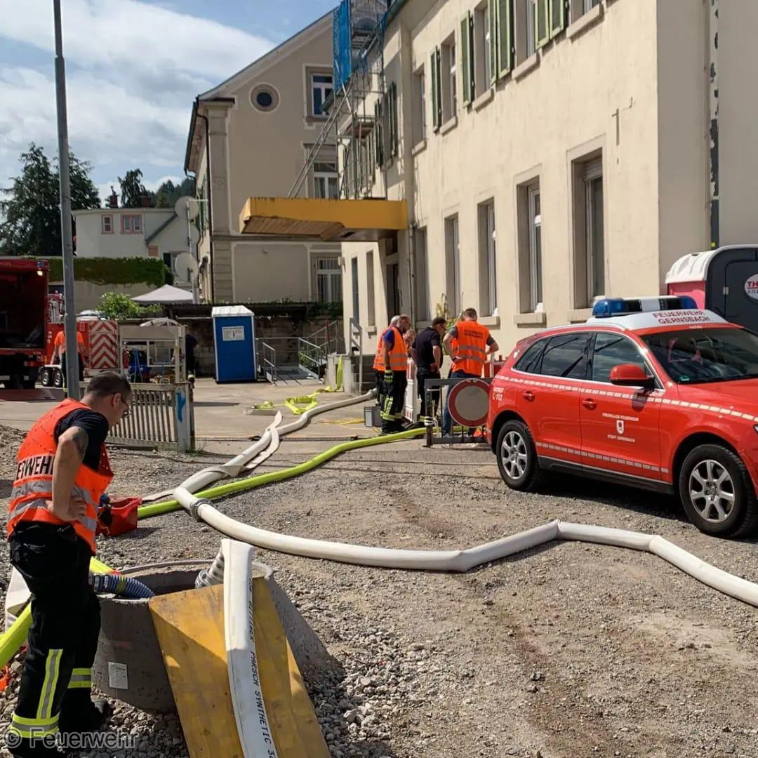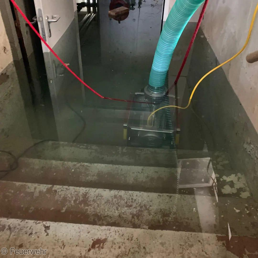 Am gestrigen Montag beschäftigte ein mehrstündiger Hilfeleistungseinsatz unsere Einsatzkräfte. Im "alten Postgebäude" stand der komplette Keller 200-250qm ca. 1,20 m hoch unter Wasser. Mit mehreren Chiemseepumpen und Wassersaugern pumpten wir rund 300.000 Liter Wasser aus dem Keller. Über mehrere B- und A-Druckschläuche förderten wir die großen Wassermengen rund 4 Stunden nach draußen in die Kanalisation. Verantwortliche der Stadt machten sich vor Ort ein Bild über die Lage. Zur Unterstützung mit zusätzlichen A-Druckschläuchen und weiteren Pumpen wurde die BF Baden-Baden nachgefordert, die mit einem Wechselladerfahrzeug und dem Abrollbehälter Hochwasser an der Einsatzstelle waren. Vielen Dank für die wie immer gute Zusammenarbeit und Unterstützung. Die Stromversorgung für die eingesetzten Pumpen stellten wir über unser mobiles Notstromaggregat sicher. Während des laufenden Einsatzes wurden wir auf eine ältere Dame aufmerksam, die orientierungslos umher lief und Schürfwunden am Arm vorweiste. Wir betreuten die Person bis zum Eintreffen eines angeforderten RTW, der die Dame letztendlich weiter versorgte. Die Aufräumarbeiten nahmen nochmals rund eine Stunde in Anspruch.