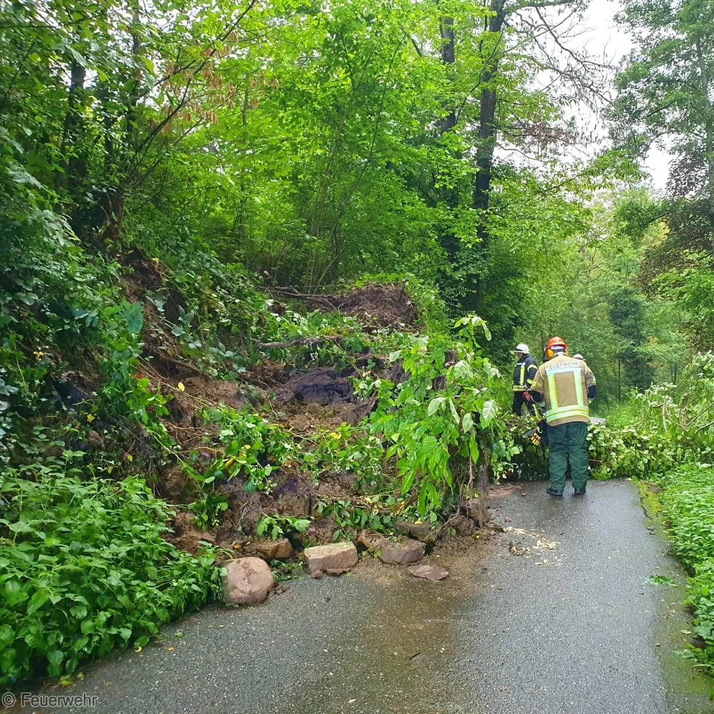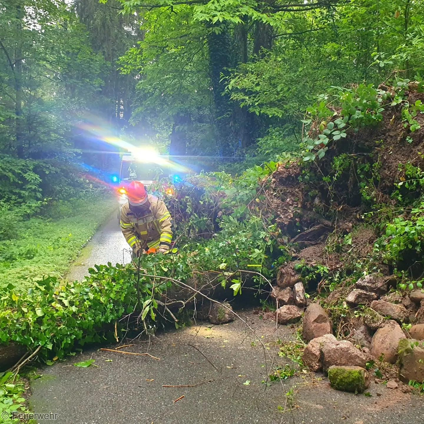 Ein umgestürtzter Baum sowie abgerutschtes Erdreich, beschäftigte uns heute Abend. Wie gemeldet fanden wir eine komplett blockierte Fahrbahn vor. Wir beseitigten den Baum und reinigten die Straße grob, sodass diese wieder passierbar war. Der Bauhof kümmert sich um alles weitere.
