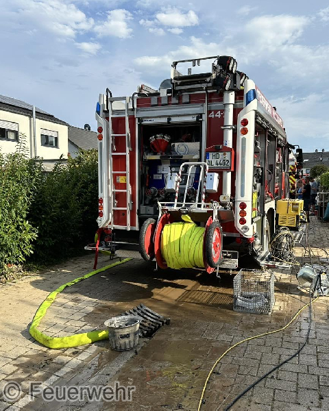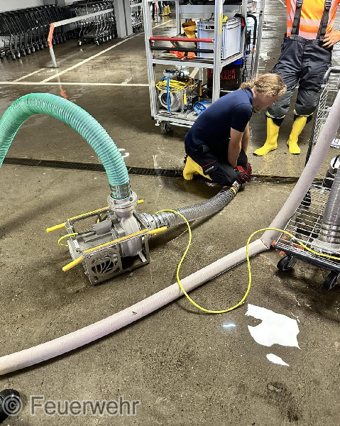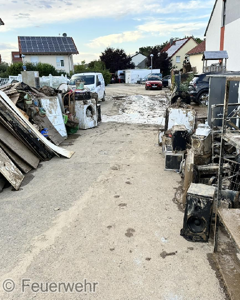 Am Morgen wurde der Hochwasserzug des Landkreises Rastatt aufgrund eines Starkregenereignisses nach Bruchsal alarmiert. Aus Gernsbach stellen wir einen ELW, einen GW-T sowie Zugführer. Insgesamt umfasste der Zug sechs Fahrzeuge und 35 Einsatzkräfte. Wir starteten gemeinsam von Rastatt als Verband nach Bruchsal. Dort angekommen erhielten wir unseren ersten Einsatzauftrag: mehrere Einsatzstellen in verschiedenen Straßen mussten angefahren, kontrolliert und ggf. Maßnahmen ergriffen werden. In der Innenstadt von Bruchsal pumpten wir einen Keller sowie eine über 5.000qm große Tiefgarage eines Einkaufsmarktes leer. Nach einer kurzen Stärkung im Feuerwehrhaus wurden wir zur Unterstützung des Hochwasserzuges aus dem Rhein-Neckar-Kreis in den Ortsteil Helmsheim geschickt. Dort waren ganze Straßenzüge mit Schlamm überzogen. Keller waren teilweise bis zur Decke mit Wasser gefüllt. Nach einer Erkundung der Lage und dem Festlegen der Prioritäten arbeiteten wir uns Haus für Haus, Straßenzug für Straßenzug durch. Wir pumpten mehrere Keller aus und unterstützten anwesende Bewohnerinnen und Bewohner sowie Helfer. Auch wurden zwei große Überflutungsflächen leer gepumpt, damit diese bei einem erneut auftretenden Starkregen wieder als Puffer für die anströmenden Wassermassen zur Verfügung stehen konnten. Am späten Nachmittag erhielten wir weitere Unterstützung durch Einheiten des THW. Während des Auspumpens von Kellern, kam es zu einem Brandeinsatz in einem Keller der betroffenen Häuser. Vermutlich aufgrund der Überflutung gab es einen Kurzschluss an einem Wechselrichter und einem Akku einer PV-Anlage. Wir stellten einen Atemschutzgerätetrupp und arbeiteten den Einsatz zusammen mit den Kollegen der Feuerwehr Altlußheim (RNK) routiniert ab. Obwohl wir mit den Kollegen aus Altlußheim noch nie gemeinsam im Einsatz waren, funktionierte die Zusammenarbeit hervorragend.