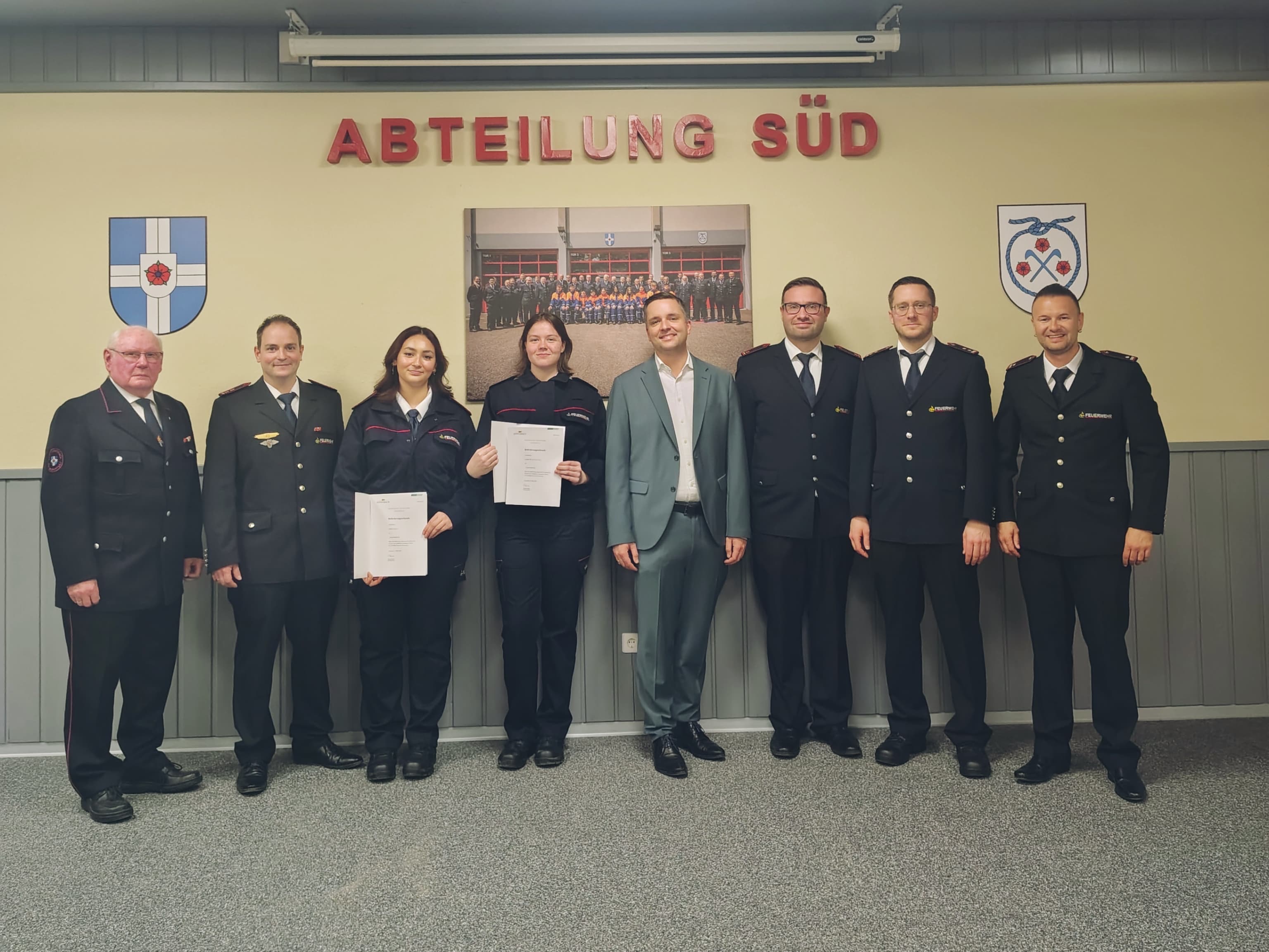Der Stellvertretende Kommandant Daniel Klumpp überbrachte die Grüße der Feuerwehr Gernsbach und dankte für die gute Zusammenarbeit und das vorbildliche Verhalten der Kameradinnen und Kameraden. Er beförderte Leonie Weinfurtner und Lina Seghir zur Feuerwehrfrau und Marc Schäfer zum Oberlöschmeister. Abteilungskommandant Schmidt durfte Roland Götz zu seinem Feuerwehrwehrruhestand gratulieren und dankte ihm für seine Dienstzeit.